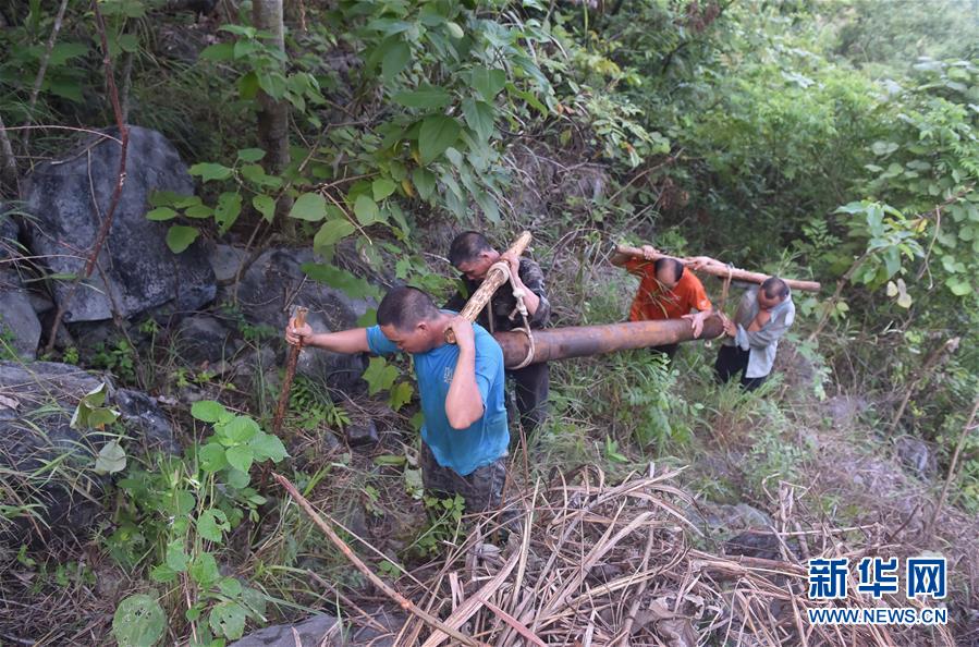 在廣西大化瑤族自治縣板升鄉(xiāng)弄雷村,工人們抬著抗旱飲水工程的水管在山路上前行(2016年8月18日攝)。新華社記者黃孝邦攝