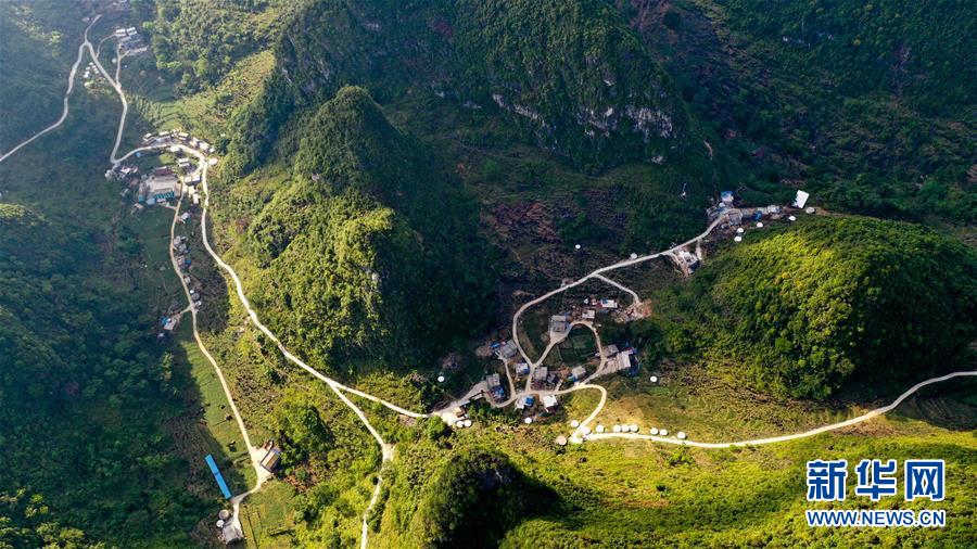 這是2019年底通車的大化瑤族自治縣七百弄鄉(xiāng)弄平村的進村路和水柜(5月14日攝,無人機照片)。新華社記者曹祎銘攝