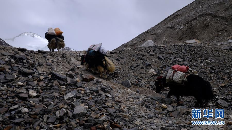牦牛運(yùn)輸隊(duì)向海拔5800米的過(guò)渡營(yíng)地運(yùn)輸物資(5月19日攝)。新華社記者晉美多吉攝