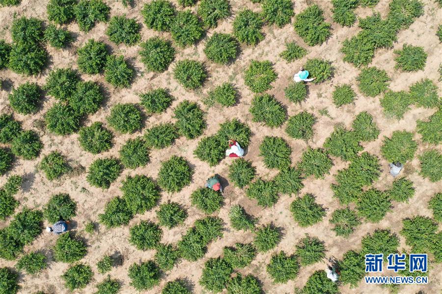 5月21日,河北省清河縣農(nóng)墾金銀花種植專業(yè)合作社社員在采收金銀花(無人機(jī)照片)。2017年以來,河北省清河縣在推進(jìn)農(nóng)業(yè)產(chǎn)業(yè)結(jié)構(gòu)調(diào)整過程中,結(jié)合市場需求,立足當(dāng)?shù)赝寥馈夂蛱攸c(diǎn),依托公司“訂單”引導(dǎo)農(nóng)民發(fā)展金銀花種植。目前,清河縣金銀花種植面積近2000畝,帶動(dòng)40多個(gè)村莊的2000余名農(nóng)民人均增收千元以上。新華社記者牟宇攝