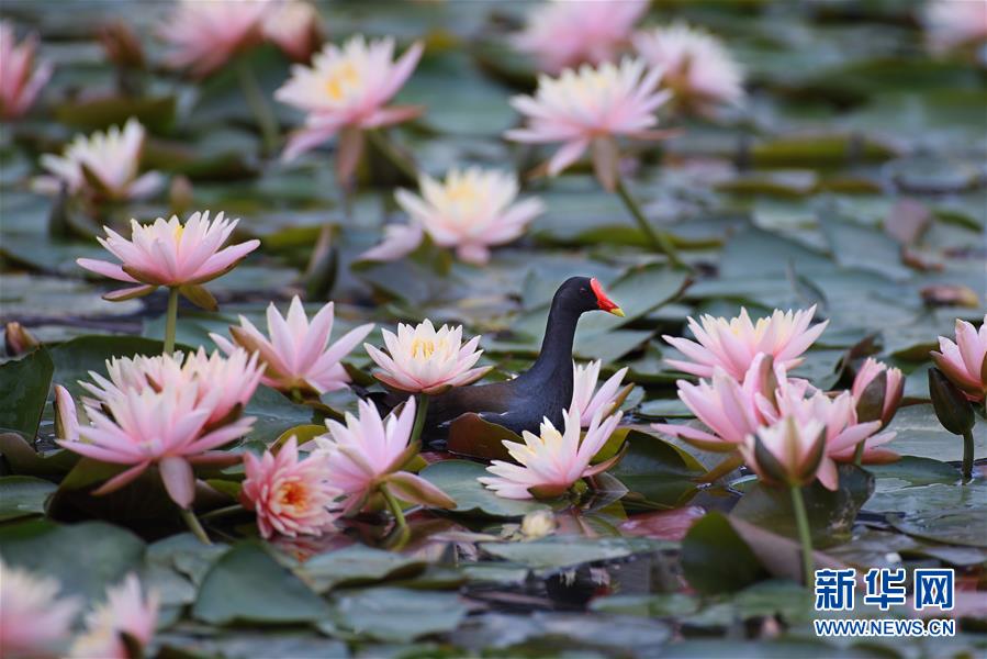 5月22日,一只紅嘴水雞在蓮葉間游弋。近日,貴陽(yáng)市觀山湖公園內(nèi)大片盛開(kāi)的蓮花吸引了不少水鳥(niǎo)在其間嬉戲覓食。新華社記者劉續(xù)攝