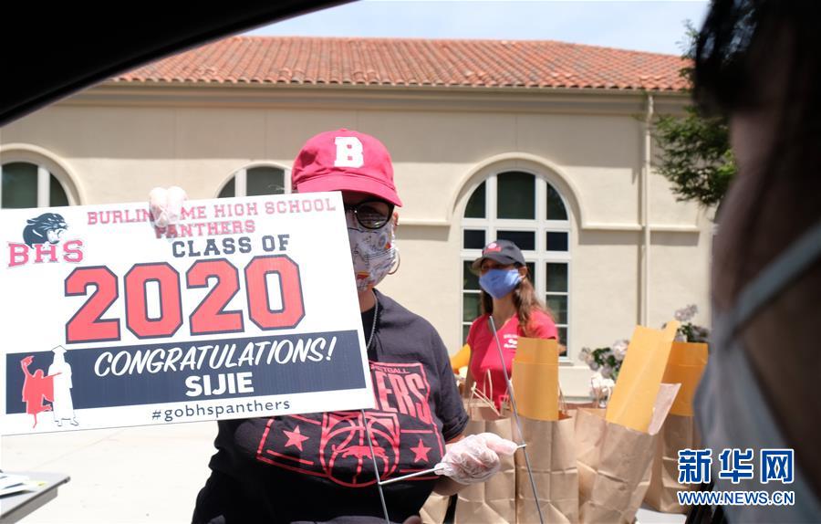 5月22日,在美國(guó)加州北部圣馬特奧縣,工作人員歡迎來辦理畢業(yè)手續(xù)的學(xué)生。新華社記者吳曉凌攝