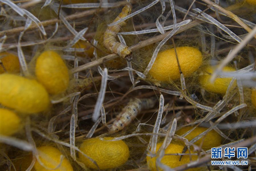 養(yǎng)殖的黃金蠶在吐絲結繭(5月27日攝)。新華社記者徐昱攝