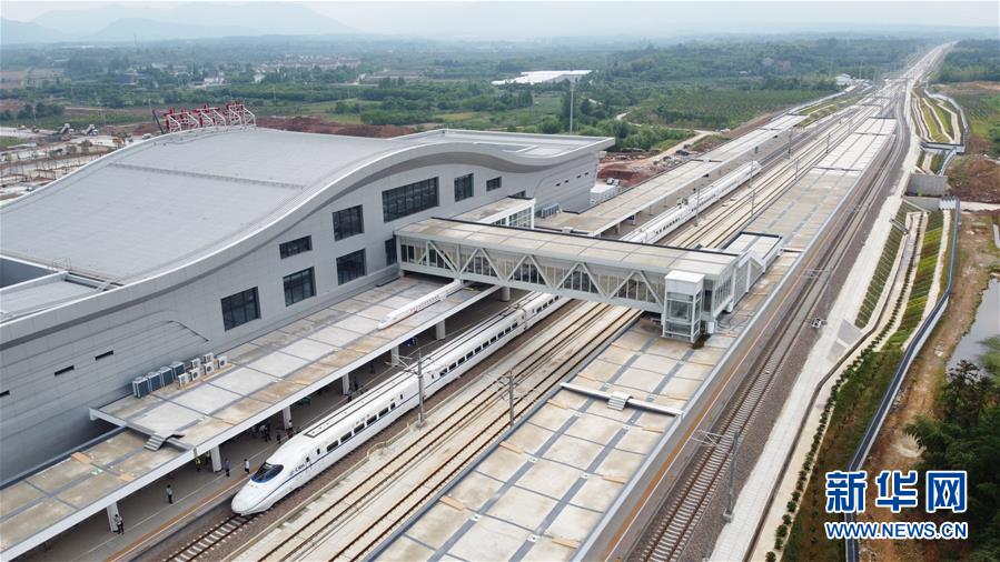 5月27日,試運(yùn)行檢查確認(rèn)列車停靠在商合杭高鐵安吉站(無人機(jī)照片)。新華社記者張端攝