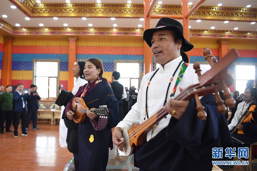 幾名藏族歌手在甘南藏族自治州瑪曲縣阿萬倉(cāng)鎮(zhèn)沃特村的文化演藝大廳內(nèi)為游客彈唱(5月25日攝)。新華社記者陳斌攝