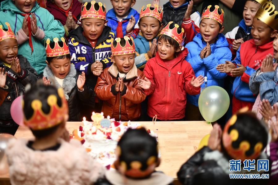 5月27日,玉麥鄉(xiāng)小學(xué)的孩子們一起唱生日歌。新華社記者王炳坤攝