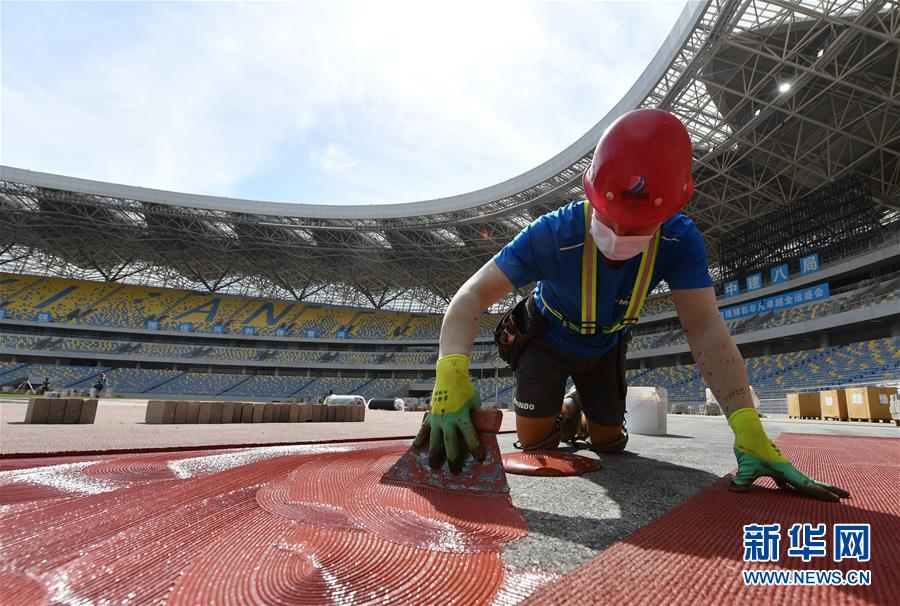 5月29日,工人在西安奧體中心體育場(chǎng)鋪設(shè)跑道。新華社記者張博文攝