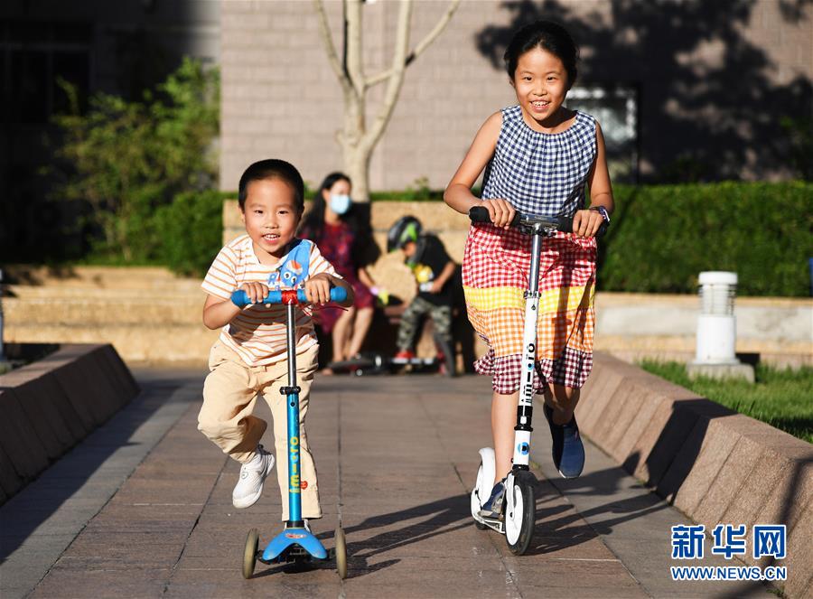 5月31日,在北京市海淀區(qū)中關(guān)村街道新科祥園社區(qū)廣場(chǎng),小朋友們?cè)谕嫠?。新華社記者任超攝