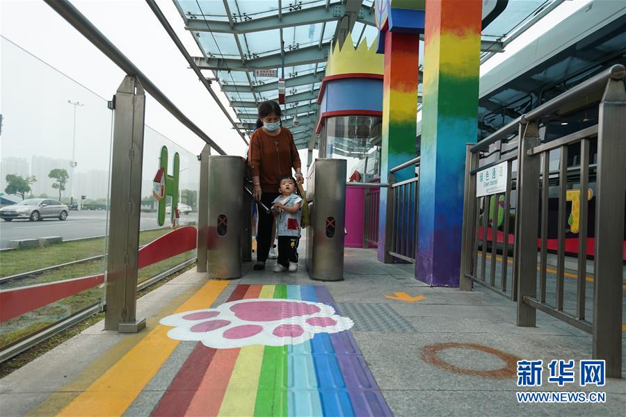 5月31日,乘客在南京市建鄴區(qū)河西新城有軌電車友誼街站候車。“六一”國際兒童節(jié)前夕,江蘇省南京市建鄴區(qū)河西新城有軌電車友誼街站裝扮一新,站臺上的城堡、熱氣球等充滿童趣的元素讓乘客仿佛置身“童話世界”。該站臨近南京市兒童醫(yī)院河西院區(qū),家長和兒童乘客較多。新華社記者季春鵬攝