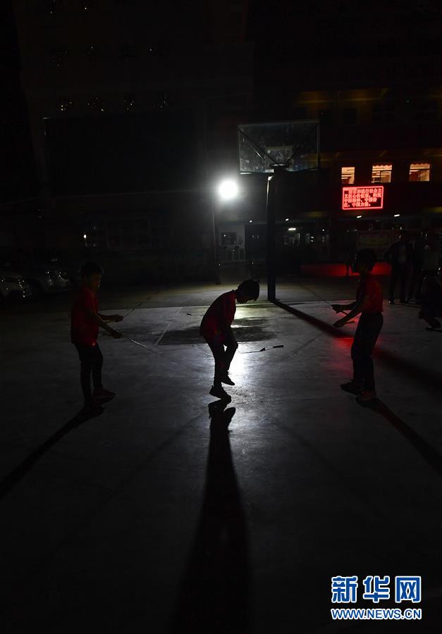 鐘煒鋒在校園小廣場上和同學(xué)練跳繩,當(dāng)天晚上,電影《點(diǎn)點(diǎn)星光》將在七星小學(xué)操場上舉行首映式(2019年11月15日攝)。新華社記者劉大偉攝