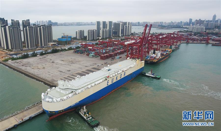 滾裝貨船“勞拉”輪駛入海口秀英港,這是海南自貿(mào)區(qū)政策實施以來的首艘汽車外貿(mào)船(2月16日攝,無人機照片)。新華社記者楊冠宇攝