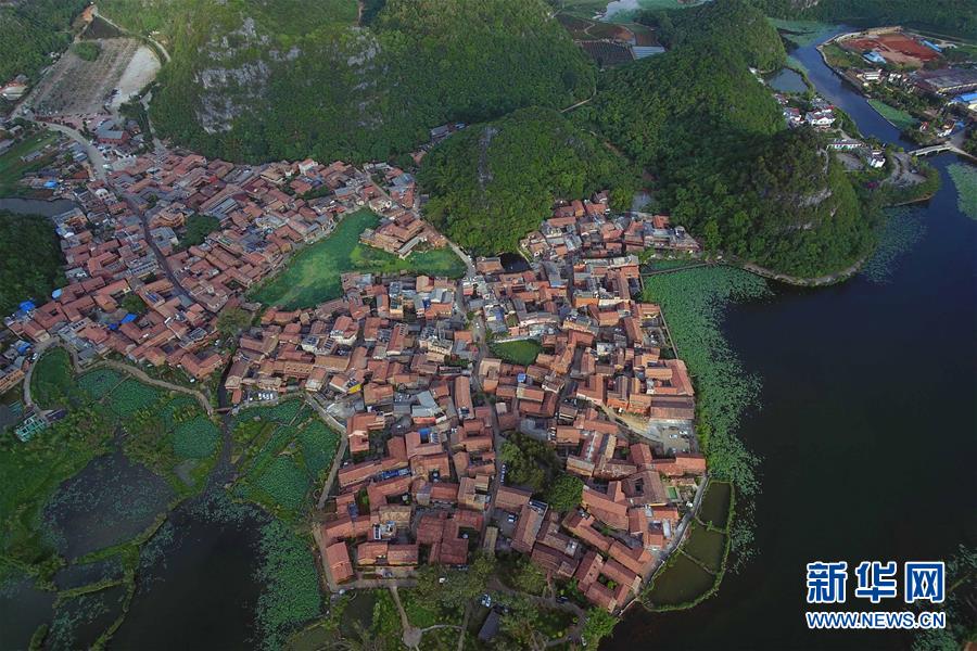 俯瞰云南丘北縣普者黑仙人洞村(6月2日攝,無(wú)人機(jī)照片)。新華社記者楊宗友攝。
