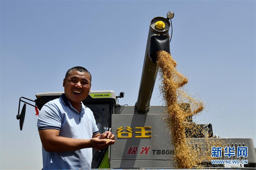 6月3日,在汶上縣郭倉鎮(zhèn),種糧大戶郭波波在收獲小麥。目前,我國(guó)第二大小麥主產(chǎn)區(qū)山東6000多萬畝小麥進(jìn)入收獲階段。農(nóng)民們搶抓有利天氣,自南向北陸續(xù)開鐮。新華社記者郭緒雷攝。