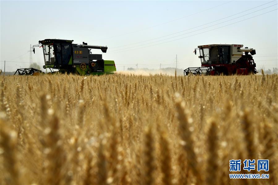 6月3日,收割機(jī)在汶上縣郭倉鎮(zhèn)的麥田里收獲小麥。目前,我國(guó)第二大小麥主產(chǎn)區(qū)山東6000多萬畝小麥進(jìn)入收獲階段。農(nóng)民們搶抓有利天氣,自南向北陸續(xù)開鐮。新華社記者郭緒雷攝。