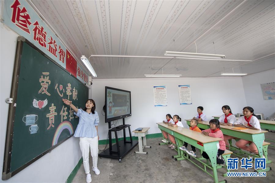 6月2日,馬武寨寄小學(xué)的英語老師陳燕子為學(xué)生們上開學(xué)第一課。新華社記者楊晨光攝。