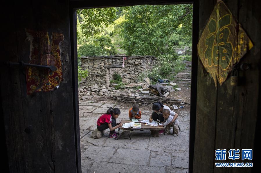 秦春蘭(右二)、秦秋蘭(左一)和秦興旺(左二)在南背村的家里學(xué)習(xí)(5月31日攝)。新華社記者楊晨光攝。