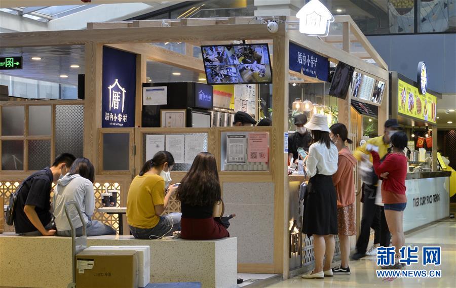 6月3日,市民及游客在西單大悅城商場(chǎng)內(nèi)購買食品。近日,游人和市民紛紛來到北京市的王府井、西單、前門大街等著名商業(yè)街購物休閑,這些老商業(yè)街開始逐步恢復(fù)昔日的繁華。新華社記者李欣攝。