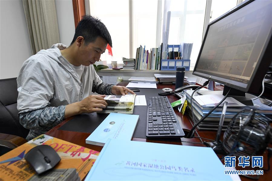 6月3日,李學(xué)明在學(xué)習(xí)鳥類知識。新華社記者馮開華攝。