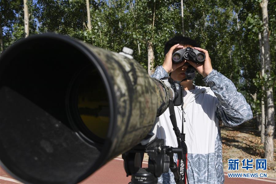6月3日,李學(xué)明利用望遠(yuǎn)鏡觀察黃河濕地的鳥類活動。新華社記者馮開華攝。