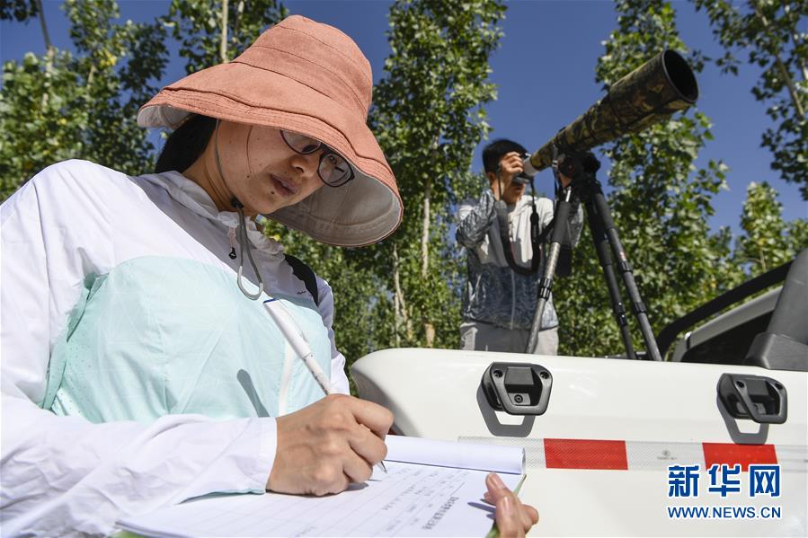 6月3日,李學(xué)明的同事張海榮(左)在填寫(xiě)濕地鳥(niǎo)類野外監(jiān)測(cè)記錄表。新華社記者馮開(kāi)華攝。