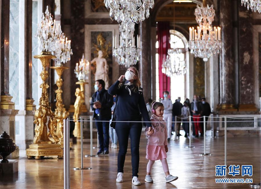 6月6日,一名游客戴著口罩在法國(guó)巴黎近郊凡爾賽宮的鏡廳內(nèi)參觀游覽。 新華社記者 高靜 攝