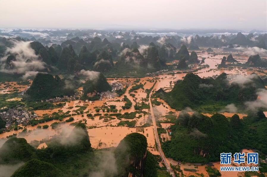 這是廣西陽朔縣部分出現(xiàn)嚴重積水的村莊(6月7日攝,無人機照片)。