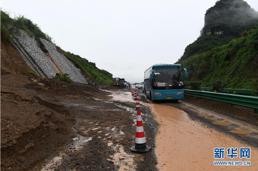 6月7日,在廣西鹿寨至陽(yáng)朔的高速公路上,車輛從一處發(fā)生滑坡的路段經(jīng)過。新華社記者陸波岸攝