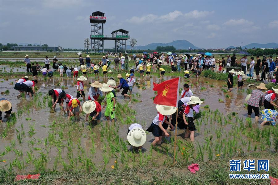 6月7日,孩子和家長們體驗稻田插秧(無人機照片)。新華社記者徐昱攝