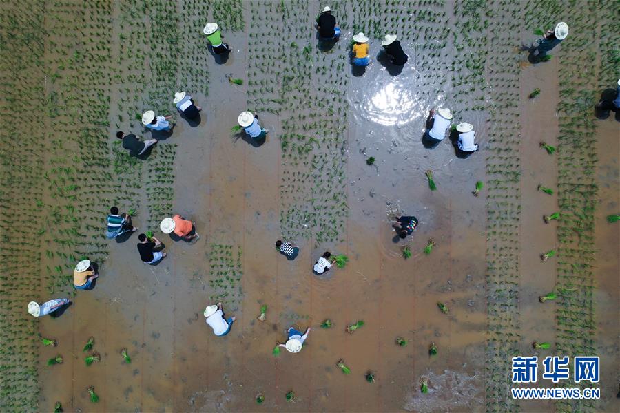 6月7日,孩子和家長們?cè)隗w驗(yàn)稻田插秧(無人機(jī)照片)。新華社記者徐昱攝
