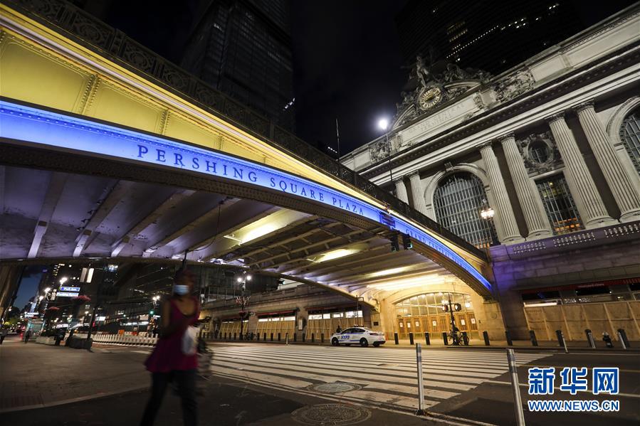 6月7日,美國紐約中央車站天橋點亮藍(lán)色和金色燈光。新華社記者王迎攝