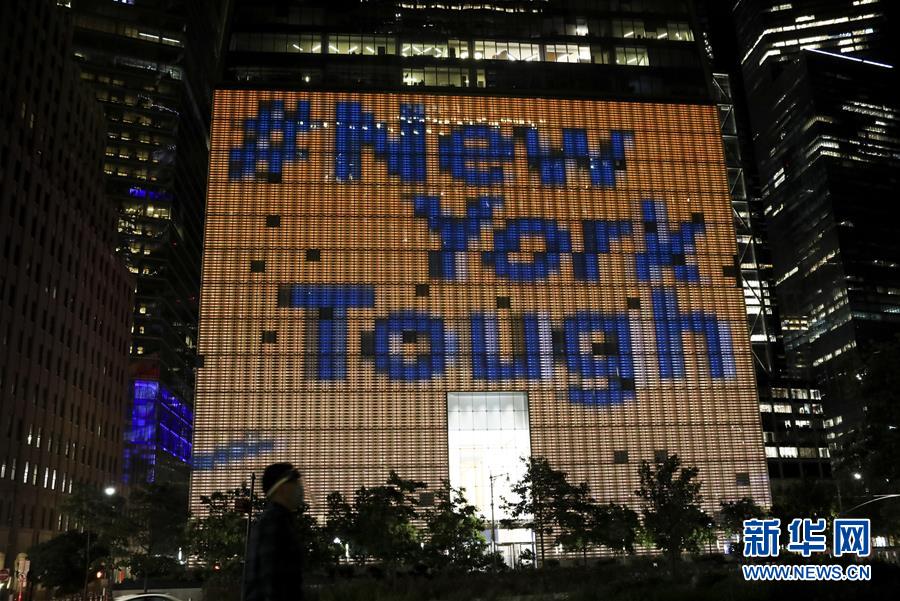 6月7日,美國紐約世貿(mào)中心一號樓外墻呈現(xiàn)出“紐約堅強(qiáng)”字樣。新華社記者王迎攝