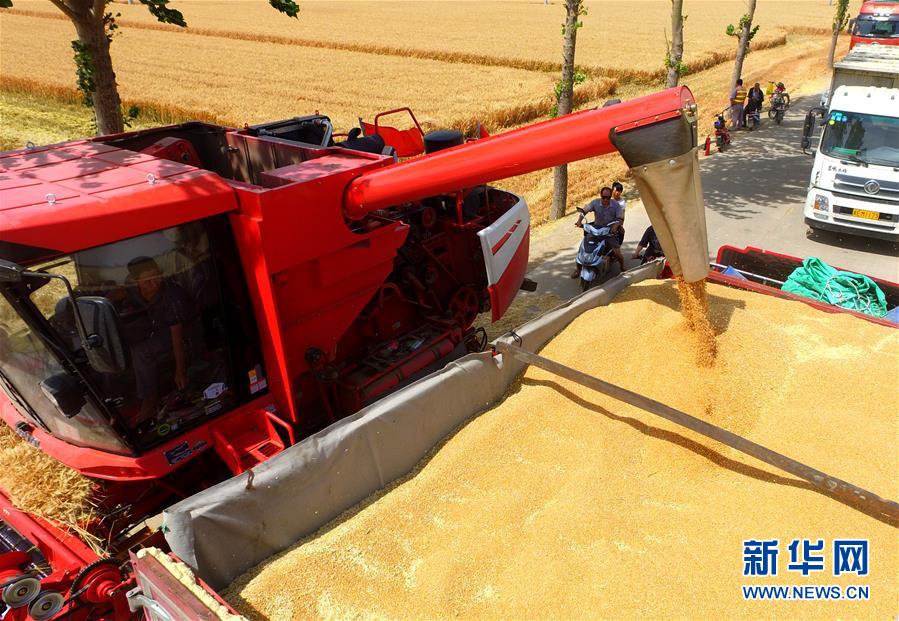 6月8日,在河北省南和縣閆里鄉(xiāng)閆里村,農(nóng)民將收獲的小麥裝車(無(wú)人機(jī)照片)?!叭摹逼陂g,河北省預(yù)計(jì)組織和調(diào)度小麥聯(lián)合收割機(jī)、拖拉機(jī)、夏玉米播種機(jī)等200萬(wàn)臺(tái)農(nóng)業(yè)機(jī)械投入作業(yè)。新華社記者朱旭東攝