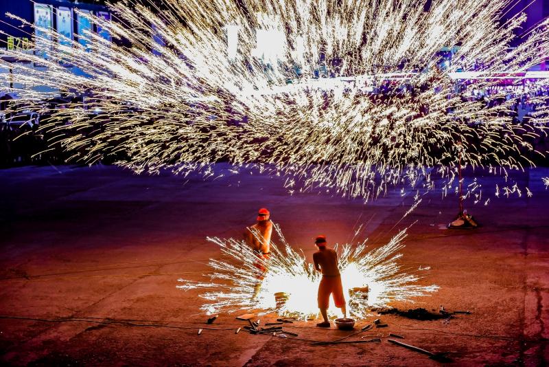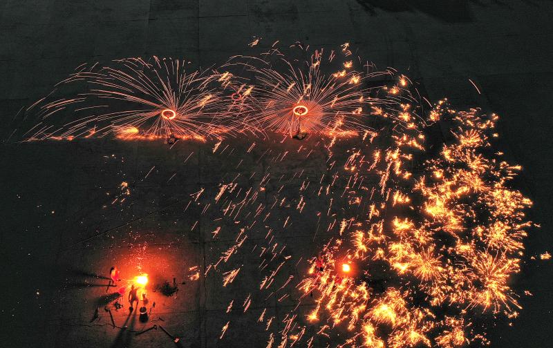 2020年6月7日晚8時(shí)許,吉林長(zhǎng)春青岡立交橋附近,神韻打鐵花表演隊(duì)改進(jìn)了傳統(tǒng)單一的擊打鐵花的形式,增添了空中轉(zhuǎn)花、高空散花、鋪地印花等多種花型。一柱鐵花沖天,在空中盤(pán)旋,朵朵銀花綻放給觀眾帶來(lái)了震撼的視覺(jué)享受。