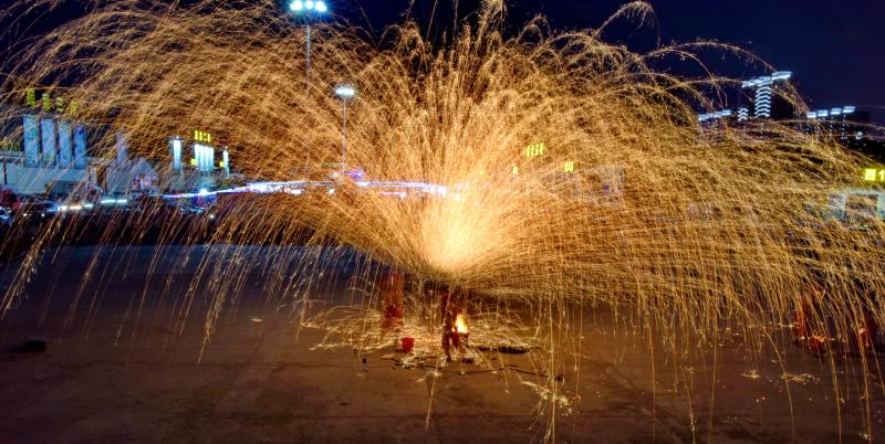 2020年6月7日晚8時(shí)許,吉林長(zhǎng)春青岡立交橋附近,古老打鐵花技藝首現(xiàn)長(zhǎng)春,1700度鐵水空中開(kāi)花。