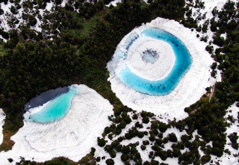 當(dāng)?shù)貢r(shí)間2020年6月8日,日本,在橫跨巖手縣與秋田縣的八幡平山頂附近的“鏡沼”,伴隨著“鏡沼”的積雪從外側(cè)逐漸融化,外圍的碧藍(lán)色湖水與中心部的潔白積雪相映成趣,呈現(xiàn)出獨(dú)特的類似“龍眼”的景象。據(jù)悉,八幡平“龍眼”奇景只在每年5月下旬至6月初的雪融期間短暫出現(xiàn)。