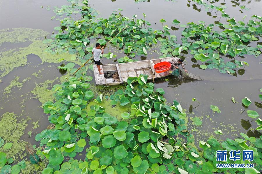 6月9日,在宿遷市宿城區(qū)中揚(yáng)鎮(zhèn)一家淺水藕套養(yǎng)小龍蝦合作社,負(fù)責(zé)人王乃國(guó)(右)在取蝦苗(無(wú)人機(jī)照片)。新華社記者季春鵬攝