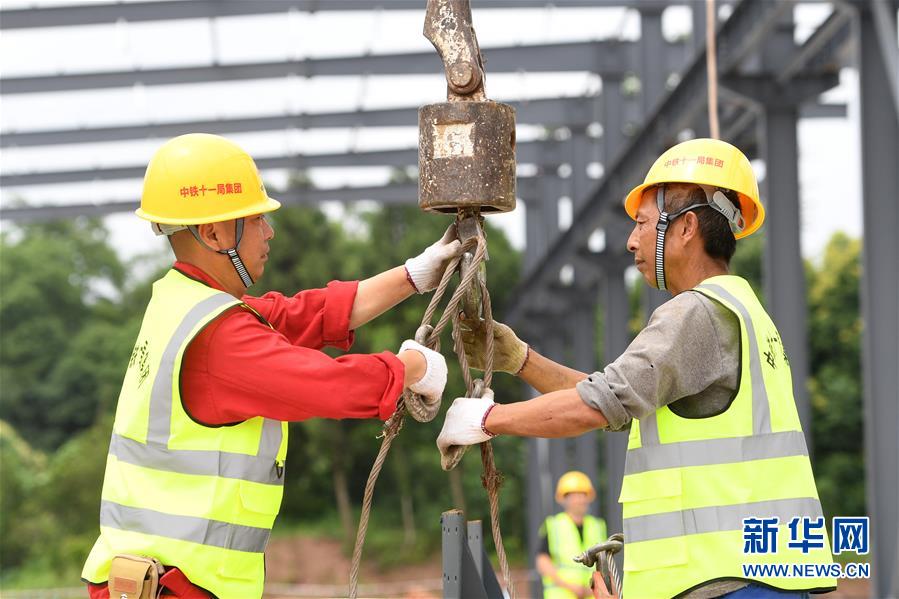 6月9日,工人在位于重慶市巴南區(qū)的渝湘高鐵重慶段建設(shè)工地現(xiàn)場(chǎng)作業(yè)。新華社記者唐奕攝