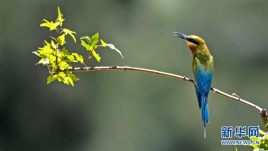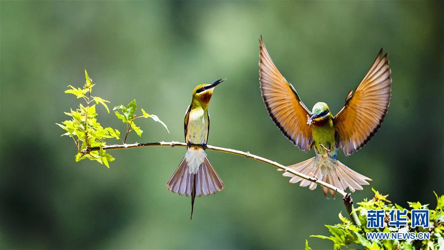 栗喉蜂虎在福建省晉江市深滬鎮(zhèn)科任村一山坡上覓食嬉戲(6月12日攝)。入夏以來(lái),逾百只栗喉蜂虎飛臨閩南晉江市深滬鎮(zhèn)科任村筑巢棲息。新華社記者記者梅永存攝。