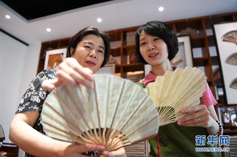 6月12日,非遺傳承人馬仁芬(左)與馬琳沁在探討夏布折扇的設(shè)計。新華社記者 唐奕 攝