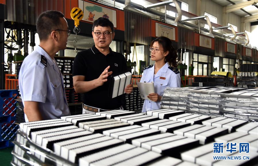 6月15日,稅務(wù)工作人員在河北省邢臺市威縣一家汽車配件生產(chǎn)企業(yè)調(diào)研稅費政策落實情況。新冠肺炎疫情發(fā)生以來,國家稅務(wù)總局威縣稅務(wù)局實施“一企一策”精準輔導,組建稅收服務(wù)小分隊,主動上門對接納稅企業(yè),解讀疫情期間稅費優(yōu)惠相關(guān)政策,確保政策落實“一戶不少、應(yīng)享盡享”,為企業(yè)提供助力。新華社記者 朱旭東 攝