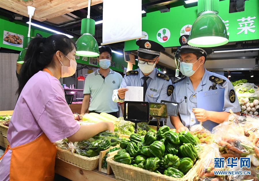 6月17日,在位于北京市海淀區(qū)的增光鴻運(yùn)市場(chǎng),執(zhí)法人員對(duì)商戶所售蔬菜的進(jìn)貨渠道進(jìn)行檢查。新華社記者 任超 攝