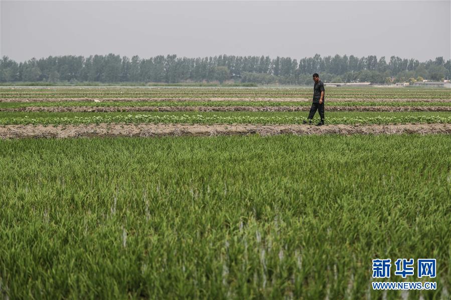 6月17日,農(nóng)民在盤錦市盤山縣太平街道張家村的稻田間查看水稻秧苗生長情況。新華社記者 潘昱龍 攝