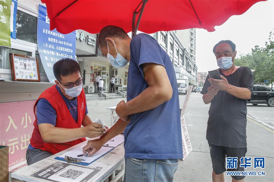 6月17日,人們在北京市西城區(qū)廣外街道小馬廠東社區(qū)的入口登記信息。新華社記者 張玉薇 攝