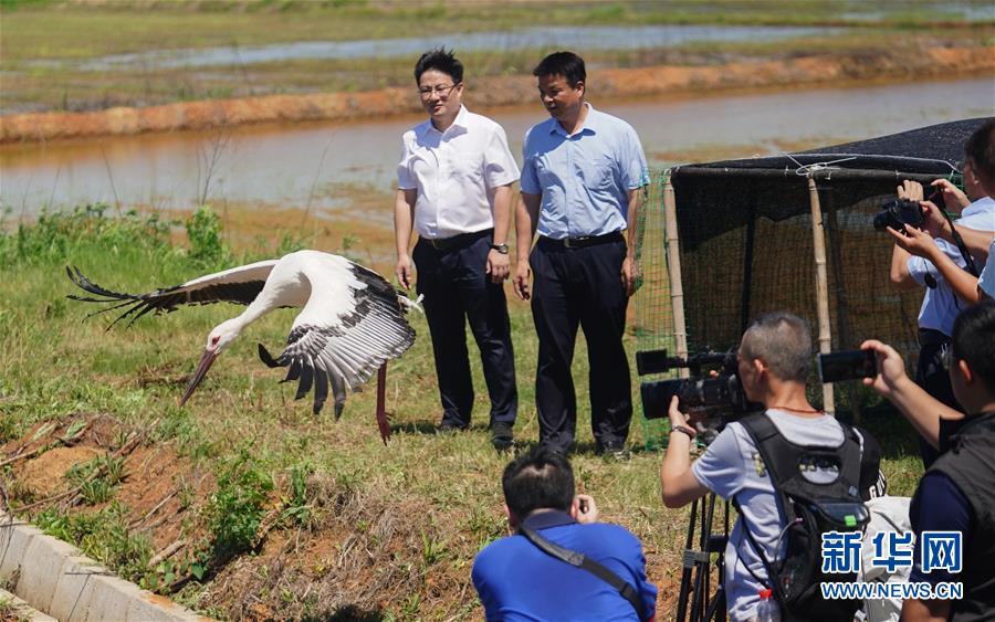 當(dāng)日,江西省林科院野生動植物救護中心在萬年縣鄱陽湖畔放飛三只被救助的東方白鸛。