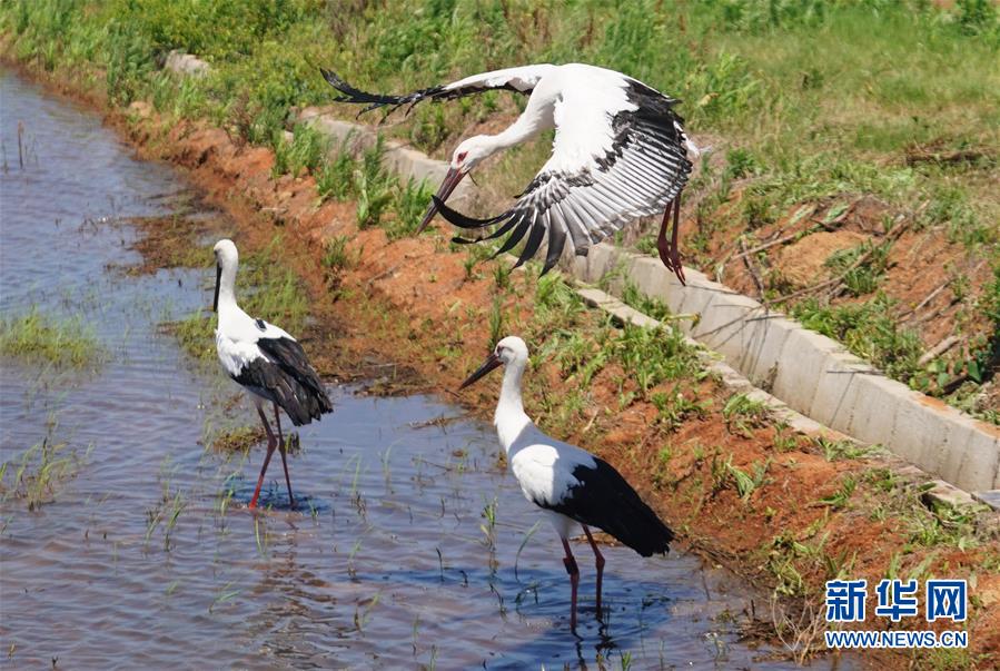 6月17日,放歸自然的三只東方白鸛在覓食。新華社記者 周密 攝