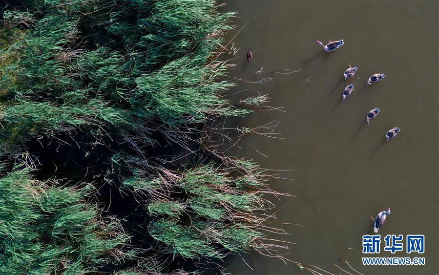 6月19日,一群鴨子在新疆烏倫古湖國家濕地公園覓食(無人機照片)。烏倫古湖國家濕地公園位于新疆阿勒泰地區(qū)福??h城以西,由烏倫古湖和吉力湖兩部分組成。烏倫古湖濕地公園是遷徙候鳥飛越天山和阿爾泰山的“能量補充站”,良好的濕地生態(tài)吸引著大量遷徙鳥類在此集結成群,繁殖棲息,成為一道靚麗的風景線。新華社記者 沙達提 攝
