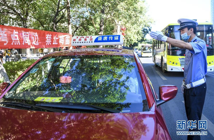 6月20日,在烏魯木齊市第二中學(xué)門前,烏魯木齊市公安局交警支隊(duì)天山區(qū)大隊(duì)新華路中隊(duì)警官羅曉亮在指揮交通。當(dāng)日,烏魯木齊市初中升高中考試開始。為保障為期三天的中考順利進(jìn)行,烏魯木齊市公安局交警支隊(duì)在各考點(diǎn)執(zhí)勤,為考生保駕護(hù)航新華社記者 王菲 攝