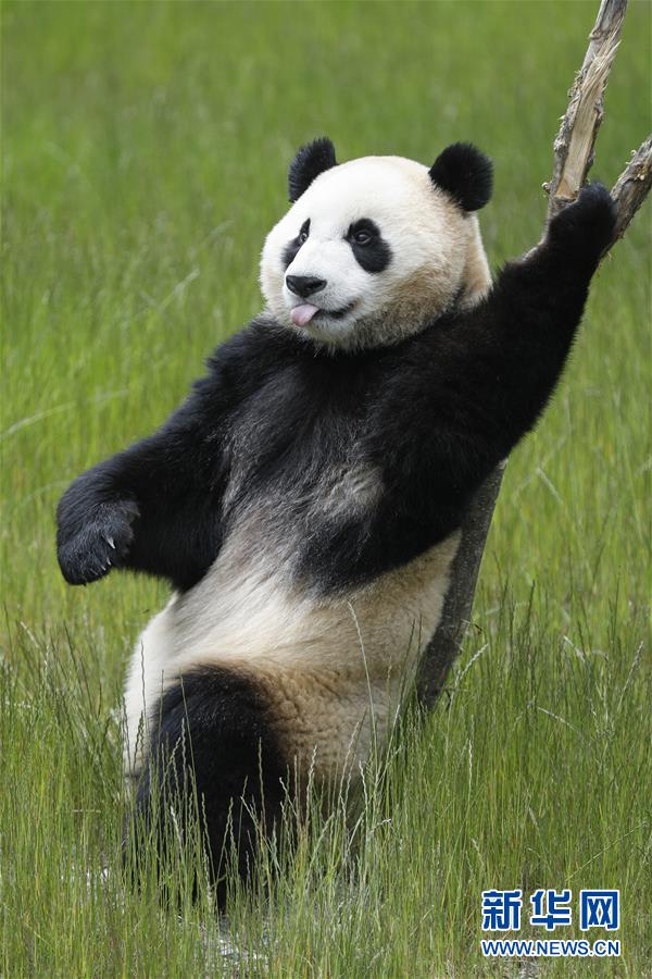 在位于四川省阿壩藏族羌族自治州的九寨溝大熊貓園,大熊貓“新新”在玩耍(6月19日攝)。新華社記者沈伯韓攝