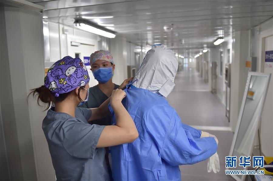 6月19日,在北京地壇醫(yī)院隔離病房外,兩位護士在幫同事穿防護服。新華社記者彭子洋攝