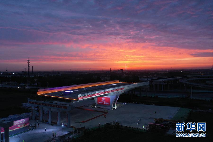 G107河北邢臺段繞城上跨京廣鐵路轉(zhuǎn)體橋?qū)崿F(xiàn)成功轉(zhuǎn)體(6月16日無人機照片)。6月16日凌晨,由中鐵十一局承建的G107河北邢臺段繞城上跨京廣鐵路轉(zhuǎn)體橋成功完成歷時60分鐘的空中轉(zhuǎn)體。這座單墩雙肢結(jié)構(gòu)轉(zhuǎn)體橋,轉(zhuǎn)體段長100米、寬34.5米,梁體總重達(dá)14200噸。新華社記者朱旭東攝